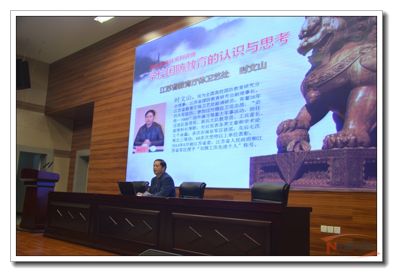 为深入开展“国防文化推广月”系列活动,11月13日晚,我校人武部、学生处邀请省教育厅体卫艺处副调研员时文山在将军路校区一号楼四楼报告厅作了题为《学校国防教育的认识与思考》的专题讲座。南京航空航天大学人武部副部长李辉主持讲座,国防生、国防协会及部分在校学生听取了讲座。