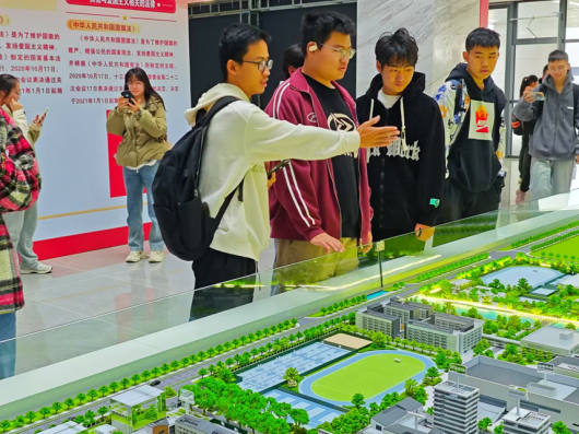 接着同学们共同“俯瞰”了南京航空航天大学天目湖校区。参观活动现场放置了校区微观模型,同学们兴致勃勃地向同伴们分享校区建筑背后所蕴含的“红色基因”与“蓝色梦想”。从“巡天遥看一千河”的巡天楼所体现的为国家航空航天事业发展不懈奋斗的报国热情,到“志在长空牧群星”的牧星楼所彰显的南航学子胸怀天下壮志昂扬的爱国热血,同学们在交流和互动中加深了对校区建设与发展的了解与体悟。
