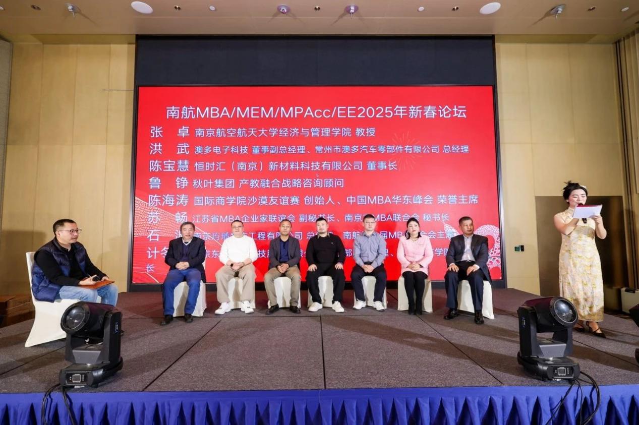 本次圆桌论坛参与嘉宾是:南京航空航天大学经济与管理学院张卓教授,澳多电子科技董事副总经理、常州市澳多汽车零部件有限公司总经理洪武,恒时汇(南京)新材料科技有限公司董事长陈宝慧,秋叶集团产教融合战略咨询顾问鲁铮,国际商学院沙漠友谊赛创始人、中国MBA华东峰会荣誉主席陈海涛,江苏省MBA企业家联谊会副秘书长、南京市MBA联合会秘书长苏畅,南京玙璠装饰工程有限公司总经理、南航第六届MBA联合会主席石波,北京东方国信科技股份有限公司事业部副总经理、东方国信学院执行院长计冬冬。论坛主题是《MBA/MEM/MPAcc的责任、创新与发展》,各位嘉宾主要从职业发展和规划、当前经济环境下的发展机遇和挑战、低空经济领域几个方面加以阐述,共同探讨如何在充满挑战与机遇的2025年,以商业智慧为帆、创新思维作桨,探寻破局之道,开创辉煌。