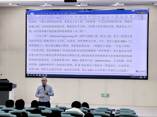 为深化专业认知教育,4月22日下午,经济与管理学院管工系张庆教授受邀于天目湖校区牧星楼T2108报告厅开展“教授面对面——工业工程面面观”活动。2024级管工系全体学生共同参与此次活动。