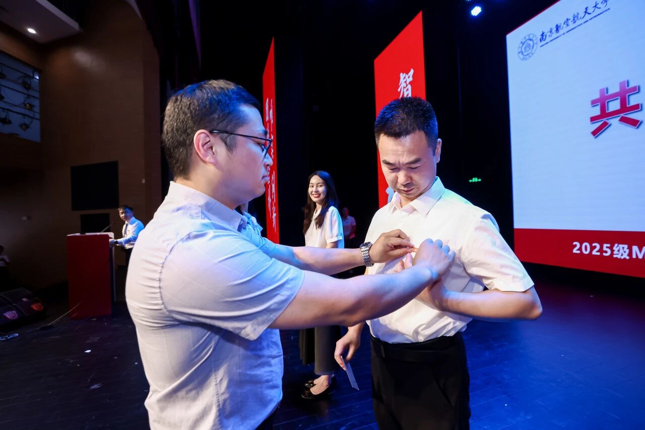 学院副书记胡苹,副院长查冬兰、欧阳林寒为三位新生代表佩戴校徽,全体新生共同宣读入学誓词,一起向学校许下遵循南航校训校风的庄严承诺。