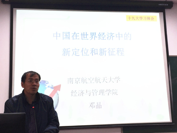 2017年12月26日下午,经济与管理学院17级博士生党支部全体党员、预备党员以及入党积极分子参加了由17级博士生党支部组织的十九大主题讲座学习活动,目的在于深入学习宣传贯彻党的十九大精神。我校党十九大宣讲团成员、经管学院副院长邓晶老师为17级博士生做了主题为“中国在世界经济中的新定位和新征程”的精彩讲座。