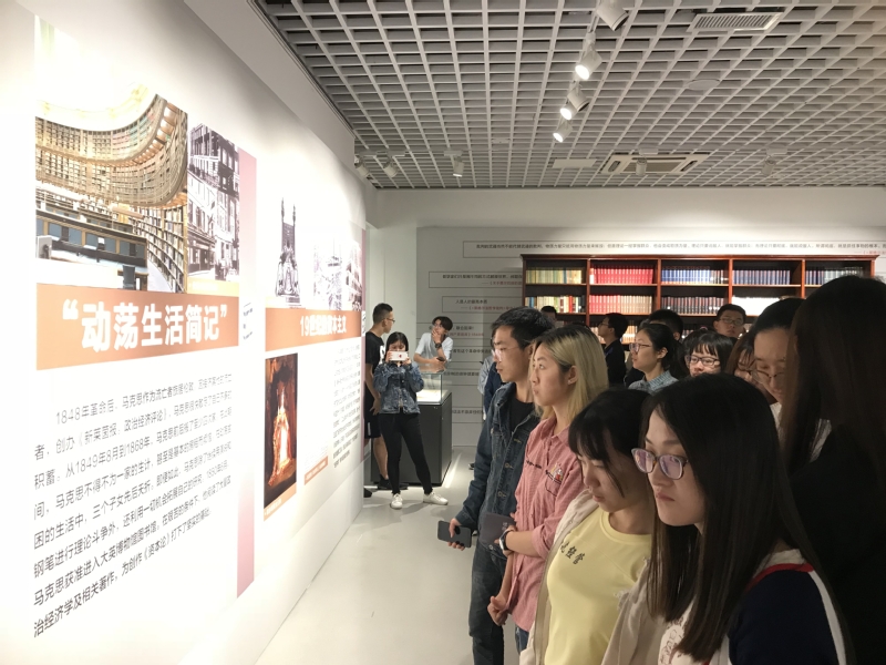 展览从“马克思主义哲学的诞生”、“社会主义从空想到科学的发展”、“剩余价值的发现”、“马克思晚年的生活和探索”和“马克思主义在传播中发展”等五个板块向同学们立体、全面地展示了一批实物与档案文献,呈现了马克思主义近200年来的发展历程。同学们回顾了这两百年的激荡岁月,仿佛穿越时空,与马克思这一千年思想家深刻交谈。