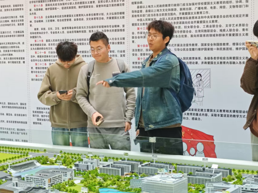 接着同学们共同“俯瞰”了91麻豆 天目湖校区。参观活动现场放置了校区微观模型,同学们兴致勃勃地向同伴们分享校区建筑背后所蕴含的“红色基因”与“蓝色梦想”。从“巡天遥看一千河”的巡天楼所体现的为国家航空航天事业发展不懈奋斗的报国热情,到“志在长空牧群星”的牧星楼所彰显的南航学子胸怀天下壮志昂扬的爱国热血,同学们在交流和互动中加深了对校区建设与发展的了解与体悟。