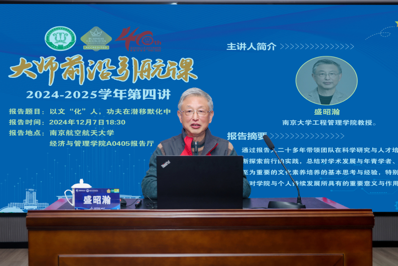 2024年12月7日晚,“大师前沿引航课”第四讲在南京航空航天大学经济与管理学院A0405报告厅举行。本期邀请到南京大学工程管理学院创院院长盛昭瀚教授授课,授课题目为《以文“化”人,功夫在潜移默化中》。经济与管理学院200余名师生参加。经济与管理学院党委书记苏州主持报告会。