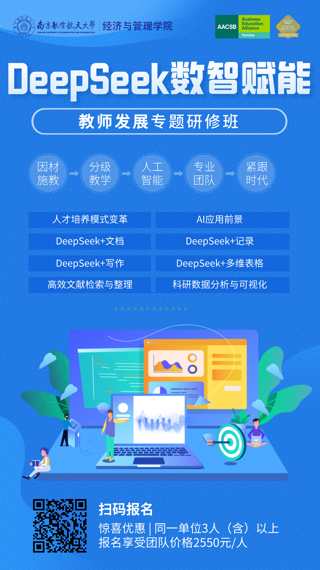 在人工智能技术飞速发展的今天,DeepSeek作为国内领先的AI教育工具,正在引领一场教育领域的智能化变革。通过智能备课、个性化教学设计、自动化助教以及复杂业务流的智能化管理等功能,DeepSeek不仅显著提升了教师的教学效率,还为教育管理者提供了更加科学、高效的决策支持工具。为了帮助广大高校教师和教育管理者更好地掌握这一前沿技术,推动教学与管理的双重创新,经济与管理学院将举办DeepSeek赋能教师发展专题研修班。本期研修班将结合教育场景中的实际需求,提供可操作、可落地的AI应用方案与案例,助力教育从业者全面提升智能化教学与管理能力。