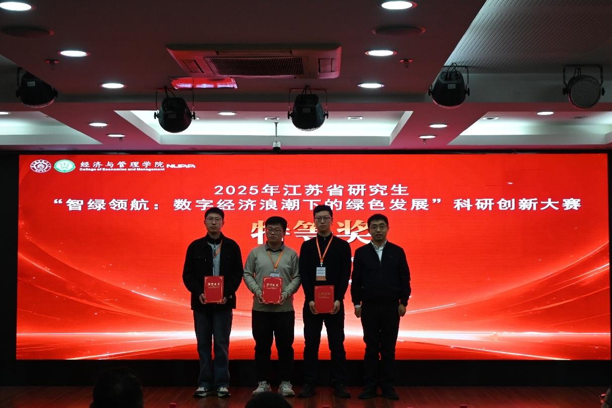 2025年12月5 - 6日,由江苏省经济学类研究生教育指导委员会主办、南京航空航天大学承办、南京财经大学联合承办的2025年江苏省研究生“智绿领航:数字经济浪潮下的绿色发展”科研创新大赛在南京航空航天大学经济与管理学院成功举办。本次大赛聚焦数字经济与绿色发展的前沿交叉领域,来自省内外 30 余所高校的百余名专家学者和研究生齐聚一堂,以科研创新为桥,共探数字经济与绿色发展的深度融合路径。