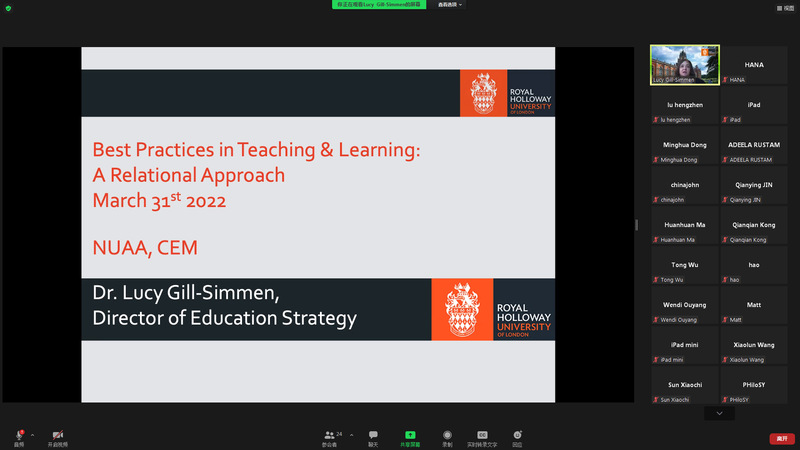 On 31th March, Lucy Gill-Simmen of Royal Holloway, University of London (RHUL) made an amazing report on the topic of“Best Practices in Teaching & Learning: A Relational Approach” to the students and teachers of NUAA. The activity was hosted by Hengzhen Lu, Associate Professor of NUAA. Ling Xiao, Associate Professor of RHUL and more than 30 young scholars of NUAA attended the activity online.